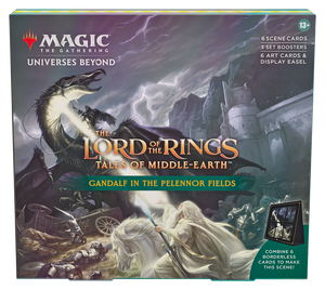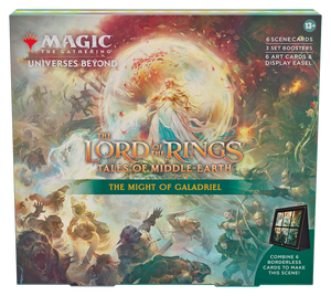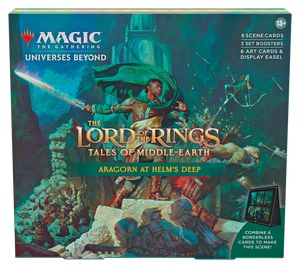 Le confezioni scena de Il Signore degli Anelli: Racconti della Terra di Mezzo™ contengono 6 carte scena foil senza bordo, 6 carte con illustrazione, 3 buste dell’espansione e un cavalletto di carta. Ogni busta dell’espansione contiene 12 carte di Magic, 1 carta con illustrazione e 1 carta pedina/promozionale, carta guida o carta della “Lista” (una speciale carta della storia di Magic, contenuta nel 25% delle buste), con una combinazione di una 1-4 carte di rarità rara o superiore e 3-7 non comuni, 3-7 comuni e 1 carta terra. Una terra foil sostituisce la carta terra base nel 20% delle buste dell’espansione e una carta con illustrazione e autografo foil dell’artista sostituisce la carta con illustrazione nel 10% delle buste dell’espansione.