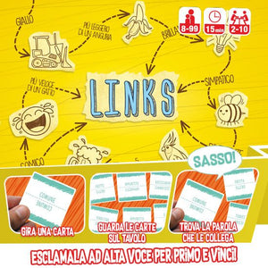 LINKS è il gioco da tavolo che unisce le idee, un party game di associazione di parole per 2-10 giocatori, dove la sfida è trovare la parola più geniale, simpatica o bizzarra che colleghi gli indizi dati.