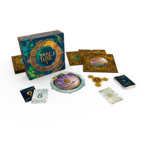 Take Time è un gioco collaborativo in cui i giocatori agiscono insieme per superare varie prove, perdendo o vincendo come una squadra. Per avere successo, dovete giocare in modo strategico 12 carte a faccia in giù intorno a un orologio, seguendo le regole speciali fornite per ogni prova.