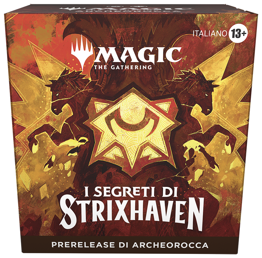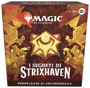 Mostra il tuo orgoglio per la tua scuola prima del giorno dell’uscita! Partecipa a un evento di Prerelease per ricevere un Prerelease Pack e sii tra i primi a scegliere la tua scuola e scopri i segreti di Strixhaven. Questi kit includono tutto ciò di cui hai bisogno per giocare, più una carta promo del Prerelease e un dado spindown specifico dell'accademia per tenere traccia dei tuoi punti vita.